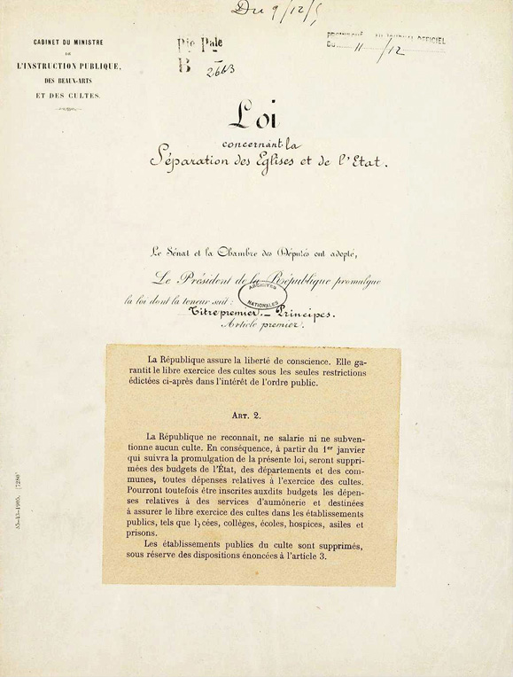 Cette loi venait clore le processus de laïcisation de la République française et devait mettre fin à la « guerre des deux France » (la France catholique conservatrice et la France républicaine progressiste). La laïcité, aujourd’hui inscrite dans la Constitution française, demeure pourtant sujette à débat tant les interprétations que l’on peut en avoir sont nombreuses.